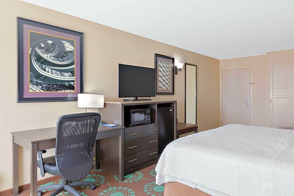 This mobility and hearing accessible, non-smoking room features one queen-sized bed and an accessible bath tub. The room also has a visual alarm and notification devices for the doorbell or door knock and incoming phone calls. The room features comfortable soft seating, microwave, refrigerator, a HDTV, and easy to operate alarm clock/radio. The free WiFi access will help you stay connected while on the road. If you prefer not to work at the desk, you can use the convenient lap desk instead. You'll also enjoy the convenience of having a coffeemaker with tea service and iron/ironing board in your room. Any corresponding photo may not reflect the specific accessible room type or room feature.